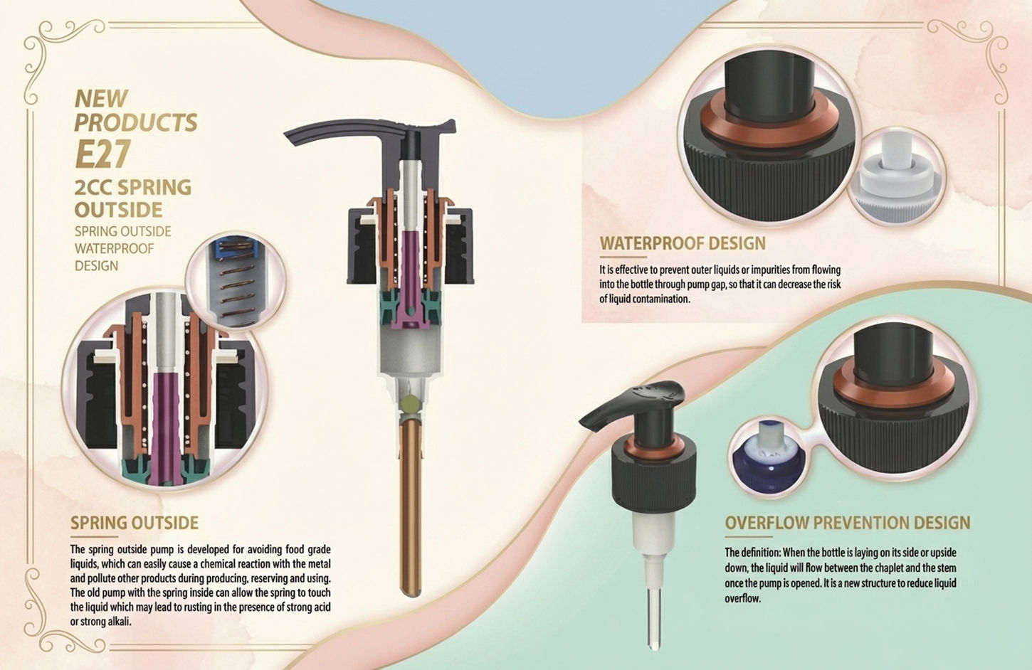 This effectivly prevent outer liquids or impurities from flowing into the bottle through the pump. The new design of this pump also prevent the liquide in the bottle to overflow when it has been opened.